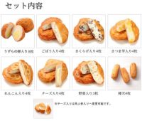 うずらの卵入り8個、ごぼう入り4枚、きくらげ入り4枚、さつま芋入り4枚、れんこん入り4枚、野菜入り3枚、チーズ入り4枚、棒天4本